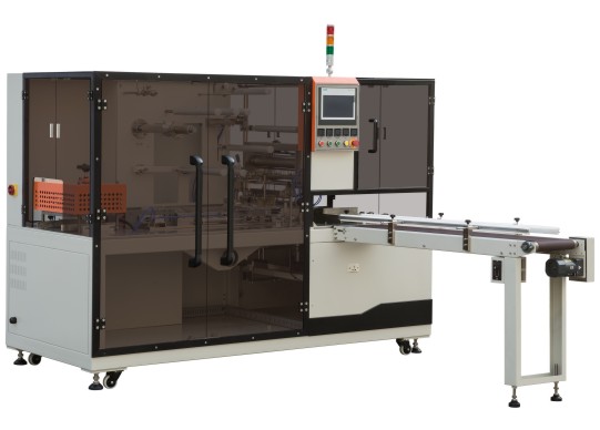 The machine is realized in terms of multifunctional digital-display frequency-conversion stepless speed regulation, PLC programmed control technology, automatic box feeding and automatic counting and touch screen display, pneumatic film falling. The work can be finished by a series of cams in the machine driving various floating links and parts. The machine can be combined to use with other production line. This machine is widely applicable to the packaging of various single large box articles, or the collective blister pack of multi-piece box articles (with gold tear tape).
